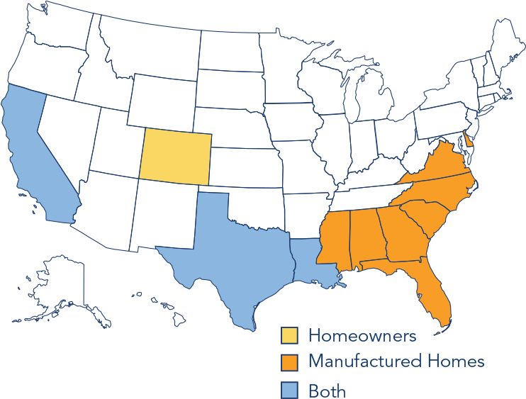 Aspera accesses manufactured housing coverage in 11 states* with flexible coverage options that include replacement cost value up to the dwelling limit, wind coverage, and more. HOMES is currently available in California, Colorado, Louisiana, and Texas* with limits up to $1M and replacement cost options.